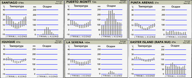 Климат: климат страны крайне разнообразен, что объясняется её большой протяженностью с севера на юг, обилием мощных прибрежных течений и влиянием горной системы Анд. На севере страны преобладает тропический пустынный тип климата. Максимальная дневная температура в этом регионе может достигать в летние месяцы +38..+40°С, а ночная - иногда опускается ниже 0 градусов. В большинстве районов Атакамы дождей не бывает вовсе, а в редкие дни, когда идет небольшой дождь, пустыня расцветает. Максимальное годовое количество осадков здесь - 50 мм, на побережье достаточно часто образуются туманы. Центральная плодородная долина, в которой расположена столица Сантьяго, является самым важным сельскохозяйственным регионом страны. Средняя температура января здесь +28°С, в июле же - около +10°С. Район озер - это бесконечная водная гладь, зеленые пастбища и бескрайние леса. Летом в этой местности около +14°С, зимой - около +4°С. О-в Чилоэ как будто “врезается” в Тихий океан; его побережье подвержено сильным штормам, сопровождающимися пронизывающими ветрами. Это одно из самых дождливых мест на планете. В зоне Магелланова пролива и на острове Огненная Земля климат полярный, летом здесь в среднем +11°С, зимой около +4°С. Сильные ветра и малое количество осадков придают этой местности аридный характер. Основной туристский сезон в Чили приходится на период с октября по март, сезон на горнолыжных курортах длится с июня по октябрь.