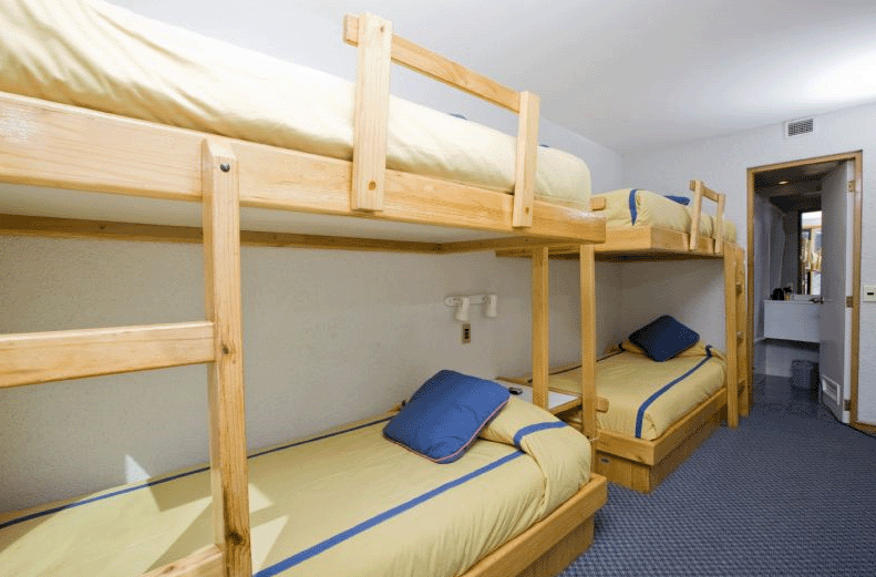 Стандартный номер Quadruple: 18.2 кв. м., некоторые номера имеют балконы, в комнате четыре односпальные кровати, для увеличения пространства комната может быть соединена с комнатой двухместного номера.